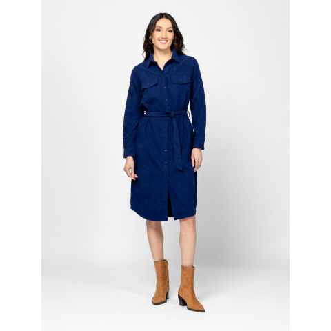 Női kordbársony ruha, klasszikus szabással, térd alatti hosszal, övvel állítható derékkal, eleje mell részen zsebfedővel, kis fém márkajelzéssel a hátán. Anyaga: 98% poliészter, 2% elasztán, microcord. A modell 175 cm magas és S-es méretet visel. T50041W2501