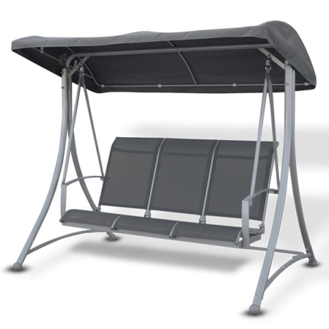 Acél váz, komax felületkezeléssel Méretei (mélység/szél./mag.): 130/185/170cm Ülőfelület: 50/145/65cm Terhelhetősége: 240kg Robusztus, háromszemélyes hintaágy napellenzővel, acélvázból, komaxos felületi kezeléssel, szürke színben. A hintaágy tekercs