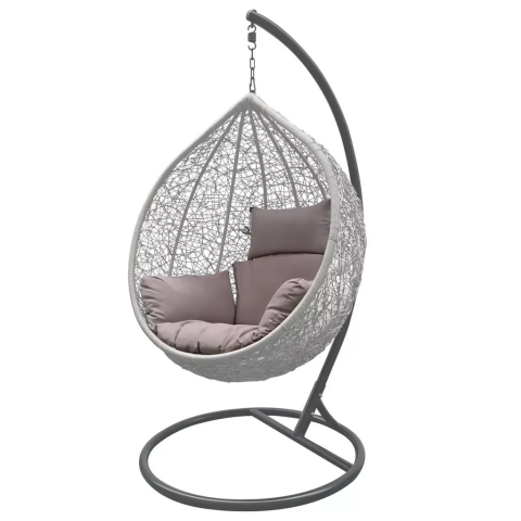 Design kerti hintaszék, acél vázzal és műrattan fonattal. Alkalmas kertek fedett részeire vagy belső térbe. Párás környezetben nem használható. Párnák és lehúzható párnahuzatok az árban. Teherbírás 120 Kg. Design kerti hintaszék, acél vázzal és műratta