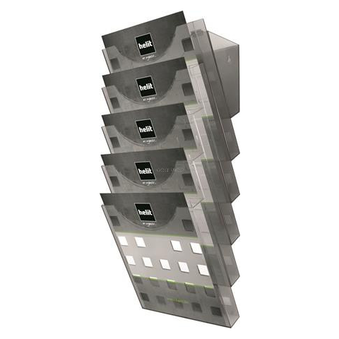 Katalógustartó, fali kiegészítővel, A4, 5 rekeszes, HELIT - különleges dizájn, prémium minőség - a szett tartalma: 5 db INH61025 rekesz + 1 db INH61030 fali kiegészítő - méret: 241x150x578 mm (A4 fali, asztali kivitel) - szín: áttetsző szürke - bővíthe