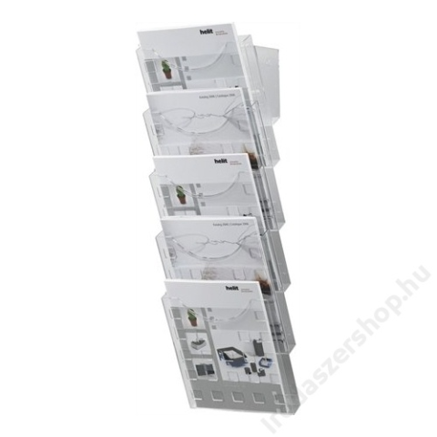 Katalógustartó, fali kiegészítővel, A4, 5 rekeszes, HELIT (INH61031) - különleges dizájn, prémium minőség - a szett tartalma: 5 db INH61025 rekesz + 1 db INH61030 fali kiegészítő - méret: 241x150x578 mm (A4 fali, asztali kivitel) - szín: áttetsző szürk