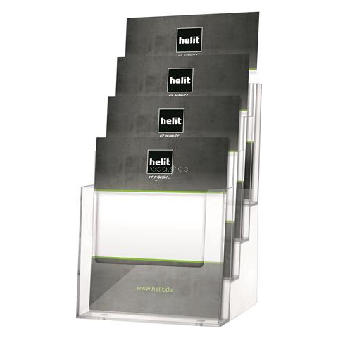 Prospektustartó, asztali és fali, A5, 4 rekeszes, HELIT - szórólapok tárolására, asztali és fali - méret: 16,5x15,5x26 cm (szé x mé x ma) - rekeszmélyésg: 30 mm Gyártó/első EU forgalmazó elérhetősége: helit innovative Bueroprodukte GmbH Muellenbacher