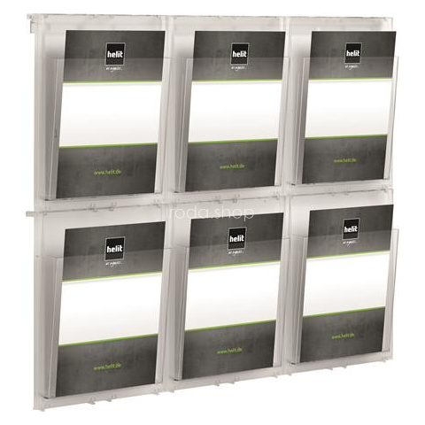 Prospektustartó, fali, A4, 6 rekeszes, HELIT Placativ, átlátszó - fali prospektustartó 6 db A4-es rekesszel - alumínium sínnel (tartozék) - méretek: 852x652x59 mm - rekesz mélysége: 35 mm - törhetetlen alapanyag, elegáns, áttetsző fényes - könnyen falr