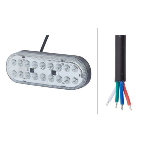 Izzó: LED Csatlakozó: 210 mm hosszú kábel nyitott kábelvégekkel Szélesség (mm): 165 Alak: téglalap alakú, két oldala lekerekített Magasság (mm): 58 Furatközép-távolság (mm): 146 Anyaga: Ház: ABS fekete, lencse: PMMA / oldalirányú optikával Fordított polar