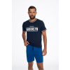 A pizsama 100%-os pamutból készült, ajándékdobozba csomagolt. A férfi pizsama 100%-os pamutból készült, ezért nagyon kényelmes. Rövid ujjjú és kerek nyakkivágású. A pizsamapóló sötétkék, elején felirat található. A pizsamaalsó derekában rugalmas gumi és meghúzható zsinór van elhelyezve. Kék színű. Az árut ajándékdobozban kapja kézhez.