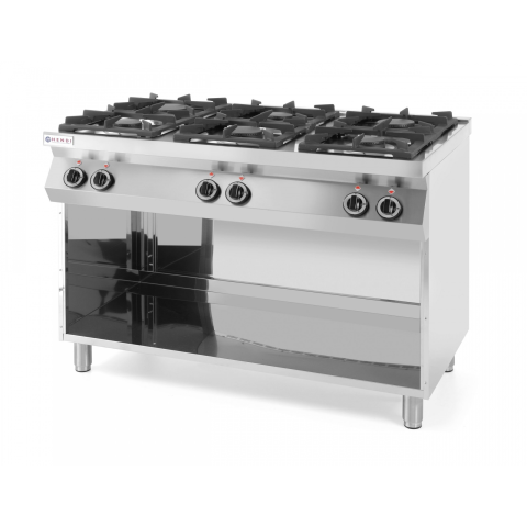 A HENDI gáztűzhely 6 égőfejes Kitchen Line nyitott állványa nagy igénybevételre tervezett gázfőzőlap, amely legfeljebb ø 300 mm méretű edényekhez használható. Három 3,5 kW-os égővel és három nagy teljesítményű 6,5 kW-os égő