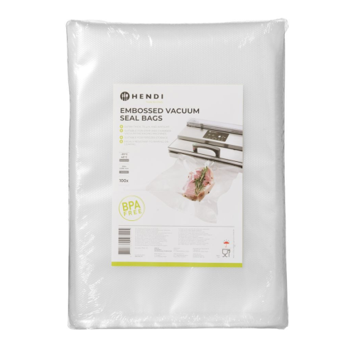 Tartsd ételeidet tovább frissen a Hendi dombornyomott vákuumtasakjaival! A 100 darabos, 250x350 mm-es, BPA-mentes tasakok szalagos és kamrás gépekkel is kompatibilisek.