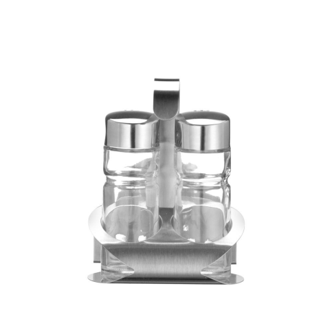 Tarts rendet az asztalon ezzel a praktikus, 3 részes HENDI fűszertartó készlettel! A szett egy só- és egy borsszórót, valamint egy beépített szalvétatartót tartalmaz, mindezt egy elegáns, matt rozsdamentes acél állványon.