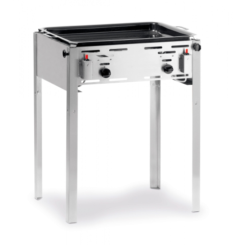 18/0 Rozsdamentes acél váz. Krómozott sütőráccsal és zománcozott serpenyővel. A serpenyő mérete 590x480 mm. Elektronikus gyújtással és hőelemmel. Gáztömlőt és nyomás szabályozót tartalmaz. Propán és