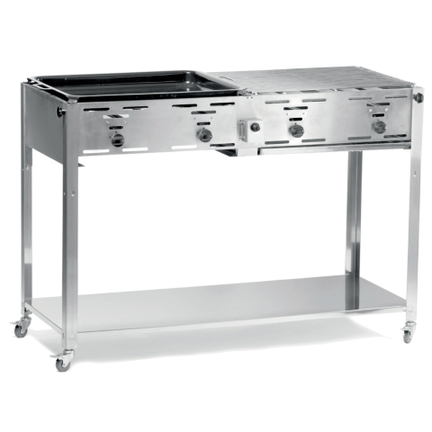 Tisztán rozsdamentes acél váz, 2 csepegtető tálcával. Propán és Bután gázról üzemeltethető, 4 külön szabályozható égővel felszerelve. 2 nikkelezett ráccsal, és 1 zománcozott pecsenyesütő tálcával rendelkezik