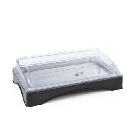 A csomag része a jégakku, ami 0°C alá hűti a tálcát. Rozsdamentes acél GN 1/1 tálcával. Átlátszó polikarbonát tetővel. ABS ház.