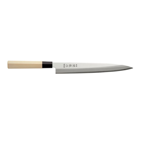 Gyártva Japánban – hagyományos japán dizájn. Az ebből a sorból származó összes kés teljes készletet alkot a hagyományos szusikészítéshez. Japán SUS 420J2 rozsdamentes acélból készült penge. Poplar fából készült fogantyú. Pengekeménység: kb. 53 HRC. Mosoga