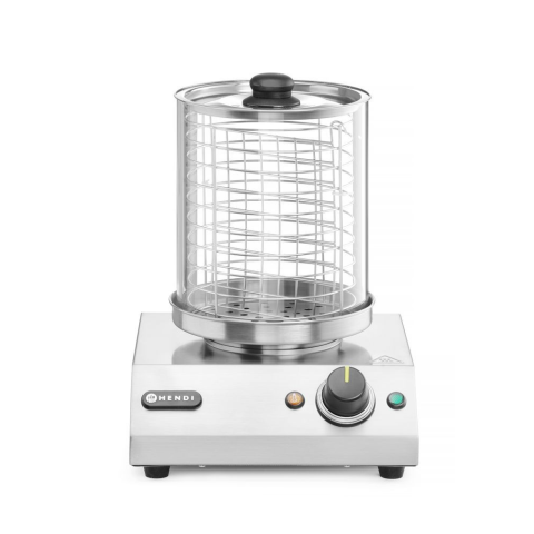 Professzionális HENDI kolbászmelegítő, amely ideális büfék és éttermek számára. A rozsdamentes acél készülék edzett üveg hengerrel nemcsak melegen tartja, hanem étvágygerjesztően is bemutatja a virsliket és kolbászokat.