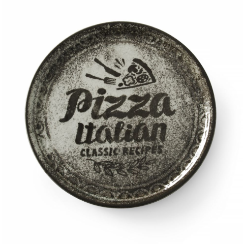 A HENDI Pizza tányér Receptgyűjtemény fekete a tökéletesen lapos formának és átmérőjének köszönhetően ideális pizza felszolgálásához. A speciális minta szöveggel és fekete háttérrel ábrázolt pizzával kiemeli a tányért. A