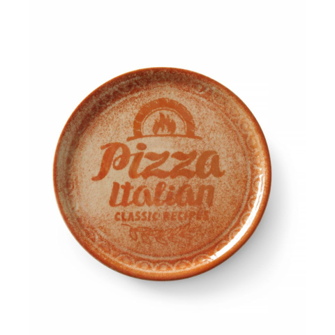 A HENDI Pizza tányér Receptgyűjtemény téglavörös a tökéletesen lapos formának és átmérőjének köszönhetően ideális pizza felszolgálásához. A speciális minta szöveggel és a pizza illusztrációjával a téglavörös háttérrel