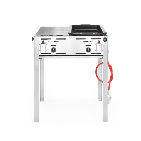 18/0 Rozsdamentes acél váz. Krómozott sütőráccsal és zománcozott serpenyővel. A serpenyő mérete 290x480 mm. Elektronikus gyújtással és hőelemmel. Gáztömlőt és nyomás szabályozót tartalmaz. Propán és