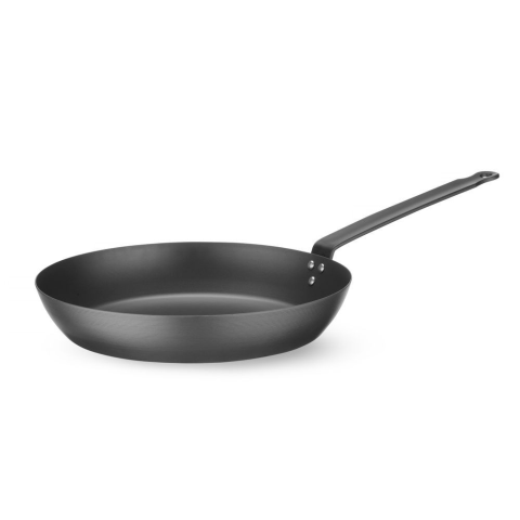 Szénacélból készült. Minden típusú tűzhelyhez használható, beleértve az indukciós tűzhelyeket is. Mosogatógépben nem mosható. MEGJEGYZÉS: használat előtt fűszerezni kell. Ergonomikus karbonacélból készült fogantyú lógó furattal. Legfeljebb 220 °C-os sütőb
