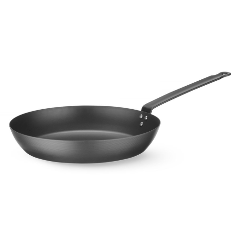 Szénacélból készült. Minden típusú tűzhelyhez használható, beleértve az indukciós tűzhelyeket is. Mosogatógépben nem mosható. MEGJEGYZÉS: használat előtt fűszerezni kell. Ergonomikus karbonacélból készült fogantyú lógó furattal. Legfeljebb 220 °C-os sütőb