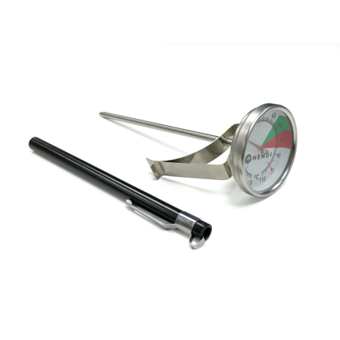 Csiptetővel a tejhabosítóhoz rögzíthető. A zöld jel mutatja a tejhab ideális hőmérsékletét cappuccinóhoz, stb. Hőmérséklet tartomány: -10ºC-tól 110ºC-ig. Fokozatok: 1ºC. Rozsdamentes acél szonda védőtokkal. Könnyen leolvasható.