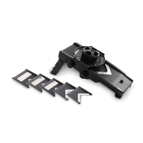 Kemény fekete PP és ABS műanyagból készült 5 kiváló minőségű rozsdamentes acélpengével. Összecsukható csúszásmentes lábak V - alakú főkés. Julienne és hasábburgonya pengéket is tartalmaz (6 vagy 9 mm széles).