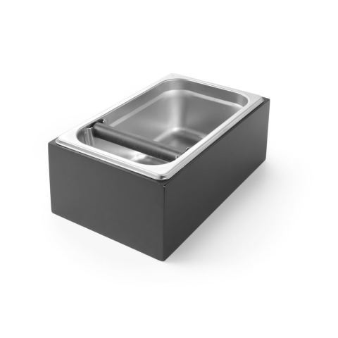 Sötét fából készült tartódoboz, rozsdamentes acél GN 1/4 zacc kiütő dobozzal. Szilikon borítású, kivehető rúd.