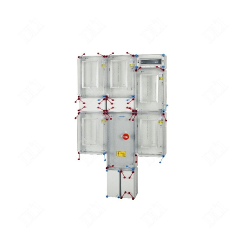 Csoportos mérőhely egyszerűsített engedlyezési eljáráshoz, 5 felhasználási helyre, 1 és 3 fázisú 1 mérőhelyes fogyasztásmérő szekrényekkel mindennapszaki méréshez 63 A-ig, földkábeles csatlakozásra, felületre szerelt kivitelben, túlfeszültség-védelmi