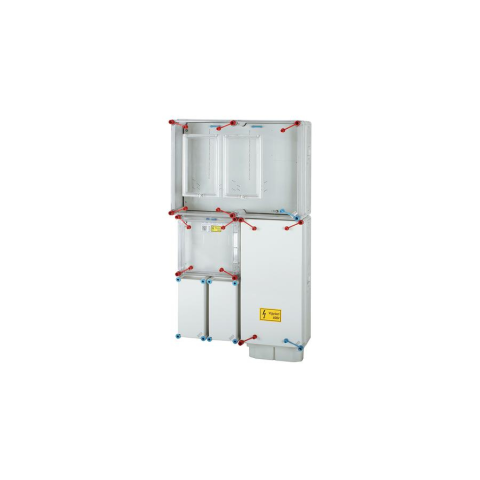 1 és 3 fázisú 2 mérőhelyes fogyasztásmérő szekrény egyedi mindennapszaki (80 A-ig) és vezérelt (32 A-ig) vagy H-tarifás (63 A-ig) méréshez, felületre szerelt, földkábeles csatlakozásra, dugaszolóaljzatos kiépítési lehetőséggel | Méret:600x1130x270 mm