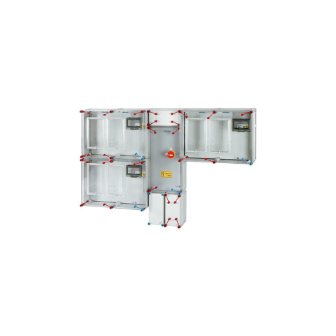 Csoportos mérőhely egyszerűsített engedlyezési eljáráshoz, 2 felhasználási helyre, 1 és 3 fázisú 3 mérőhelyes fogyasztásmérő szekrényekkel mindennapszaki (63 A-ig) és vezérelt (32 A-ig) vagy H-tarifás (63 A-ig) méréshez, földkábeles csatlakozásra, felületre szerelt kivitelben, túlfeszültség-védelmi eszköz beszerelési lehetőséggel, tűzeseti lekapcsolással | Méret:"E2