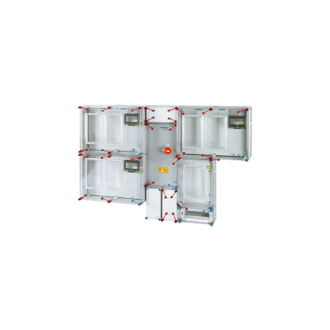Csoportos mérőhely egyszerűsített engedlyezési eljáráshoz, 3 felhasználási helyre, 1 és 3 fázisú 2 mérőhelyes fogyasztásmérő szekrényekkel mindennapszaki (63 A-ig) és vezérelt (32 A-ig) vagy H-tarifás (63 A-ig) méréshez, földkábeles csatlakozásra, felületre szerelt kivitelben, túlfeszültség-védelmi eszköz beszerelési lehetőséggel, tűzeseti lekapcsolással, közösségi méréssel | Méret:"E2