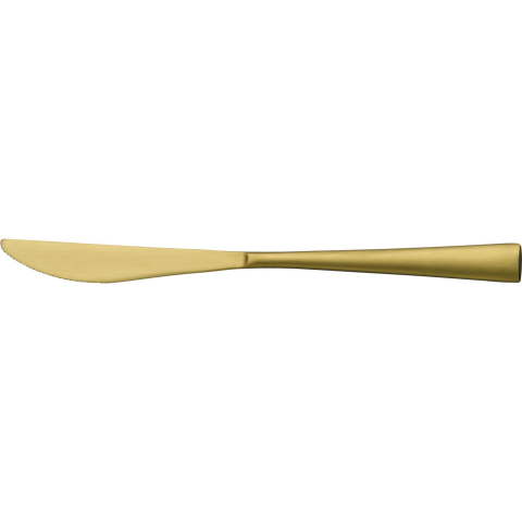 Aranyszínű Hepp Accent desszertkés teljes kivitelben, kartácolt felülettel. Hossza 220 mm, a penge hossza 100 mm. Krómacélból és PVD arany bevonattal készült. Elegáns, dizájnos darab minden alkalomra. A Hepp márka az evőeszközök terén a minőség és az elegancia szimbóluma.