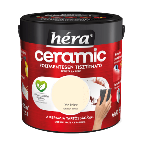 Héra Ceramic foltmentesen tisztítható beltéri falfesték a kerámia tartósságával. Hipoallergén bevonat. Fertőtleníthető. Selyemmatt. Hidrofób és páraáteresztő. Extra dörzsálló