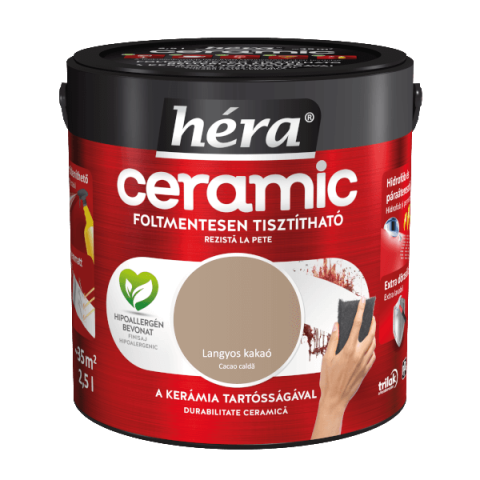 Héra Ceramic foltmentesen tisztítható beltéri falfesték a kerámia tartósságával. Hipoallergén bevonat. Fertőtleníthető. Selyemmatt. Hidrofób és páraáteresztő. Extra dörzsálló