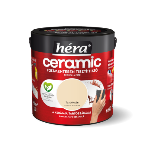 Héra Ceramic foltmentesen tisztítható beltéri falfesték a kerámia tartósságával. Hipoallergén bevonat. Fertőtleníthető. Selyemmatt. Hidrofób és páraáteresztő. Extra dörzsálló