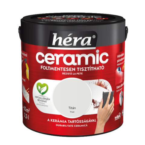 Héra Ceramic foltmentesen tisztítható beltéri falfesték a kerámia tartósságával. Hipoallergén bevonat. Fertőtleníthető. Selyemmatt. Hidrofób és páraáteresztő. Extra dörzsálló