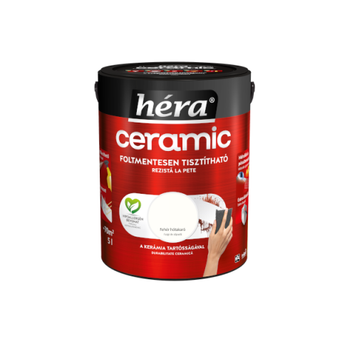 A Héra Ceramic speciális mikrokerámia-gyöngy tartalmának köszönhetően a legellenállóbb Héra beltéri falfesték. A kerámia technológia kimagasló mosás- és dörzsállóságot biztosít a felületnek, így téve azt foltmentesen tisztíthatóvá és fertőtleníthetővé. A Héra Ceramic falfesték hidrofób alkotórészei révén vízlepergető bevonatot képez, miközben innovatív kötőanyag szerkezete kiváló páraáteresztő tulajdonságot biztosít. A hipoallergén, selyemm