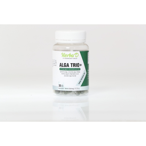 Herba-D alga trio kapszula 30 db Összetevők: Spirulina alga kivonat, chlorella alga kivonat, kombu alga (Aminaria japonica) kivonat, kőalga (Lithothamnium Coralloides) kivonat, HPMC (kapszula anyaga), Haematococcus pluvialis alga kivonat