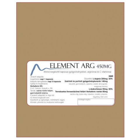 Element ARG 450mg étrend-kiegészítő kapszula gyógynövényekkel, argininnal és C vitaminnal.A természetes immunitás támogatásához, a szervezet felépüléséhez. Összetétel (450 mg töltőtömegű kapszulánként):● L-Arginin 200mg● Szárított és porított gyógynövé