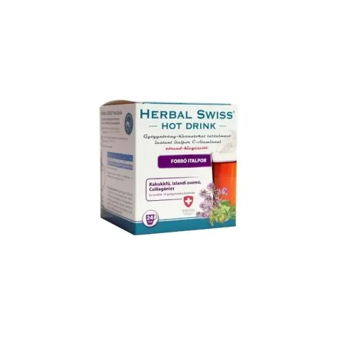 Herbal Swiss hot drink instant italpor 24x8g 192 g Gyógynövény-kivonatokat tartalmazó instant italpor C-vitaminnal étrend-kiegészítő. Kellemes hatású a szájra, a torokra és a hangszálakra, C-vitaminnal együtt szerepük van az immunrendszer működésében.