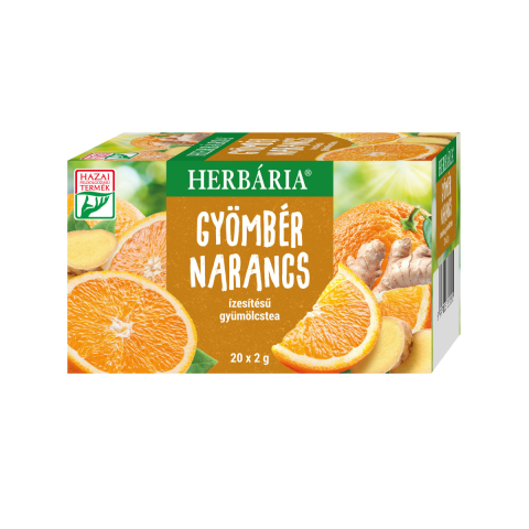 Herbária gyömbér narancs ízesítésű gyümölcstea 20x2g 40 g Frissítő lendület és fűszeres harmónia. A narancs citrusos üdesége és a gyömbér karakteres íze tökéletes párost alkotnak. almatörköly, homoktövis levél, rooibos, narancs aroma (10%), gyömbér gy