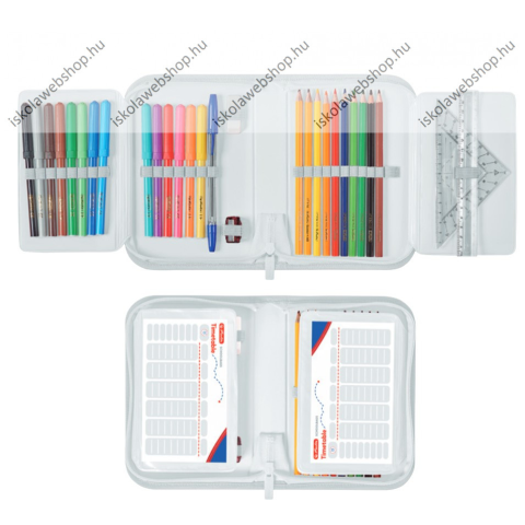 Termékleírás: - 31 részes tolltartó 20,3x14x3,5 cm-es méretben, 2 klapnis. - Tartalma: 14 db filctoll, 1 db golyóstoll, 1 db radír, 1 db ceruzahegyező, 2 db grafitceruza, 8 db színesceruza, 1 db egyenes vonalzó, 1 db háromszög vonalzó, 1 db órarend, 1 db