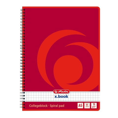 A5-ös méretű 80 lapos kockás spirálfüzet, 70g/m2-es famentes belívvel, lyukasztott, perforált lapokkal, ikerspirállal, lekerekített sarkokkal.
