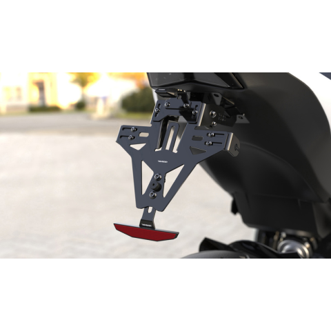A HIGHSIDER AKRON-RS rendszámtartó tökéletesen illeszkedik a motorodra vonzó designjának köszönhetően.A rendszámtartó modellspecifikus, könnyű felszerelést tesz lehetővé az eredeti rögzítésekhez való hozzáigazítás nélkül.2 mm vastagságú acélból készült és lézerrel vágott, időjárásálló bevonattal rendelkezik.Teljesen állítható, a tartót a kívánt pozícióba állíthatod. Egy további zárócsavar biztosítja, hogy a tartó a helyén maradjon.A AKRON-RS