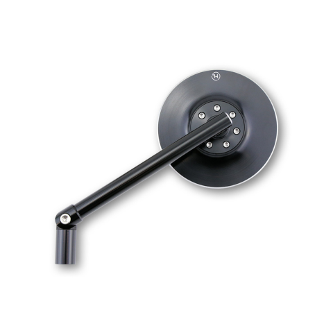 HIGHSIDER CONERO tükör, E-jóváhagyott, 2 változatban.– Fekete eloxált változat ezüst díszítéssel –Elegáns CNC megmunkált univerzális tükör kerek eloxált alumínium fejjel fekete vagy matt fekete színben. A fogantyún lévő második ízületnek köszönhetően tová