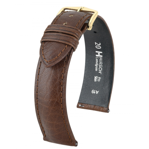 Az óraszíjak érzékeny bőrű szerelmesei szeretik a HIRSCH Essential termékcsalád klasszikus bőrkímélő termékét. A Hirsch Camelgrain robusztus borjúbőrből készül, amely a rostmélységig dobfestve van és HIRSCH Pro Skin védőbevonattal van ellátva. A Pro Skin