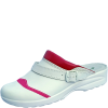 KIFUTÓ MODELL TÍPUSVÁLTÁS MIATT! Csak a készleten lévő darabszámok elérhetőek belőle! Hirsch 615C női, pántos, fehér klumpa, fuxia színű betétekkel. Minősített bőr papucs rendkívül kényelmes bőr talpbéléssel. Hirsch minősített munkavédelmi klumpa - minő