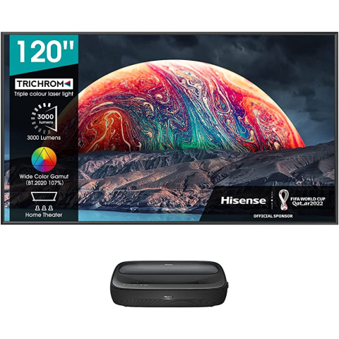 Projektor - DLP technológia, 3840 × 2160 4K UHD max. felbontás, 3840 × 2160 px natív felbontás, 16:9 képarány, ultra short throw - ultrarövid vetítési távolság, 120 Hz képfrissítési frekvencia, lézer fényforrás, enyhén világos helyiségek - 2000-3000 lm, USB 2.0 és LAN, Vidaa operációs rendszer, HDR, hang vezérlés, smart funkciók, globális alkalmazások: NETFLIX, Disney+ és Apple TV, tápkábel a csomag része, tömege 15,5 kg Márka kiválasztása:Televízió 120" H