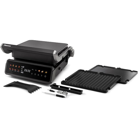 Kontakt grill - 2000 W teljesítmény, 2 db, alumínium, összesen 1344 cm2 grillfelület, grill anyaga: rozsdamentes acél, időzítő, kijelző, tapadásmentes felület, csepptálca, csúszásgátló lábak, hőszabályzás, állapotjelzés, hőmérséklet-érzékelő, kivehető rács és fogantyú zár, tömege: 8 kg Hisense HCG2000D kontakt grillA Hisense HCG2000D kontakt grill szaftos steakeket, paninit, burgereket és grillezett zöldségeket készít neked. 10 automatikus programot kíná