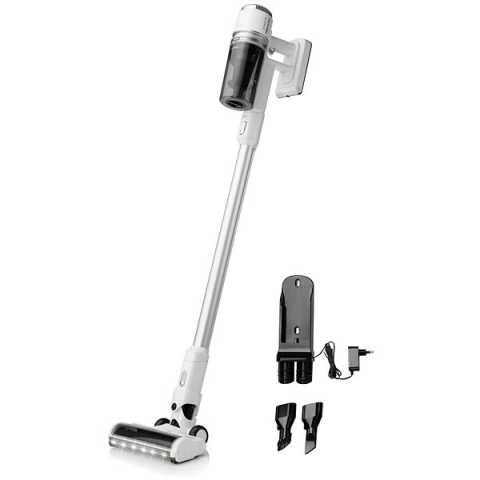 Álló porszívó - akkus, alkalmas minden padlótípushoz, száraz tisztítás, felszívás, Li-ion akkumulátor, működési idő 35 perc, töltési idő 4 óra, mosható szűrő, 110 W teljesítmény, zajszint 78 dB, műanyag gyűjtőtartály 0,5 l űrtartalommal, vezérlés a készüléken, töltöttségjelző, LED akkumulátor töltöttségi állapot jelző és teljesítmény szabályozás, hosszabbító cső, mérete 111,2 × 25 × 25,5 cm (Ma×Sz×Mé), tömege 2,3 kg, fali tartó és sz