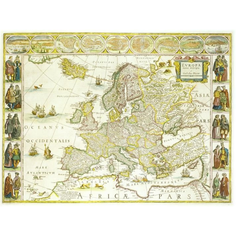 Evropa (1640 körül) Guilielmo Blaeuw: Europa recens descripta a, . Amstelodami, [1640] Az Amszterdamban élő kartográfus, műszerkészítő, kiadó, nyomdász és könyvkereskedő Williem Blaeu munkája e gazdagon díszített Európa térkép, amelynek keretét korabeli
