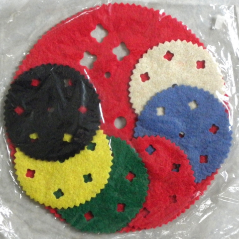 Filc díszterítő szett. 17 cm átmérőjű kör - piros + + 6 db 7 cm kör - vegyes színek. Egyedi, kézműves gyapjúfilc termék. Méret: 17 cm - kör + 6 db 7 cm kör. Szín: nagy - piros, kicsik - vegyes színek. Ajánlott karácsonyi ajándék.